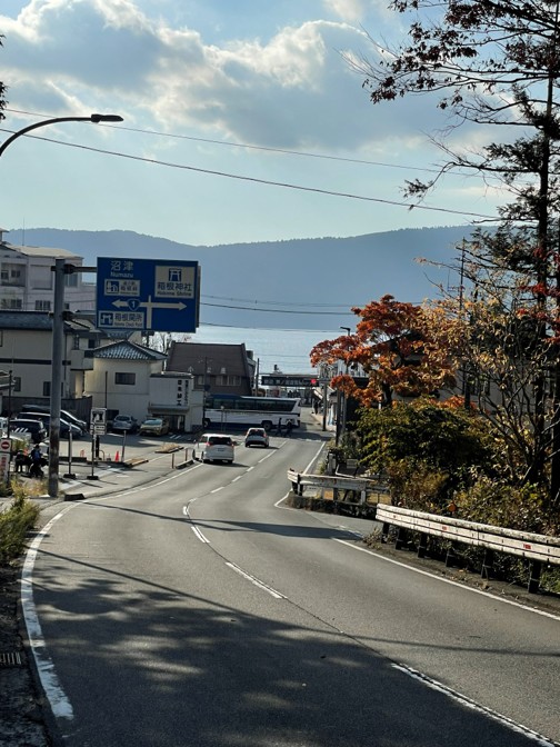30分ほど、結構急な下り坂を降りきると、見えてきました。芦ノ湖。いやぁ長かった。あの信号を左折すれば、あともう少しでゴールのはず。